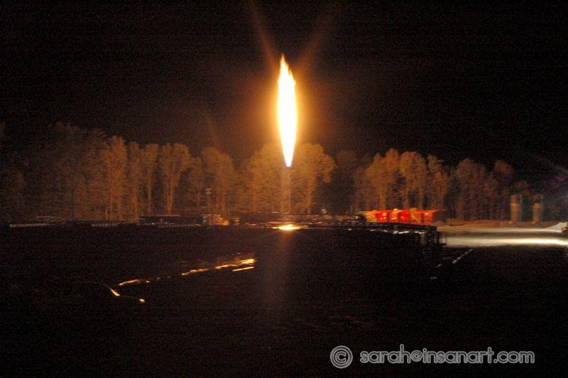 Check out the size of that flame - the trees behind it are AT LEAST 40 foot tall (if not 50). This burn off practice is ILLEGAL in many countries. Where it is not completely illegal, the burns are taxed HEAVILY, or they are required to pump the gass back into the ground. HEY PENNSYLVANIA, that's 1000's of dollars of potential tax revenue (not to mention loads of harmful greenhouse gas emmissions) just floating away into the atmosphere.